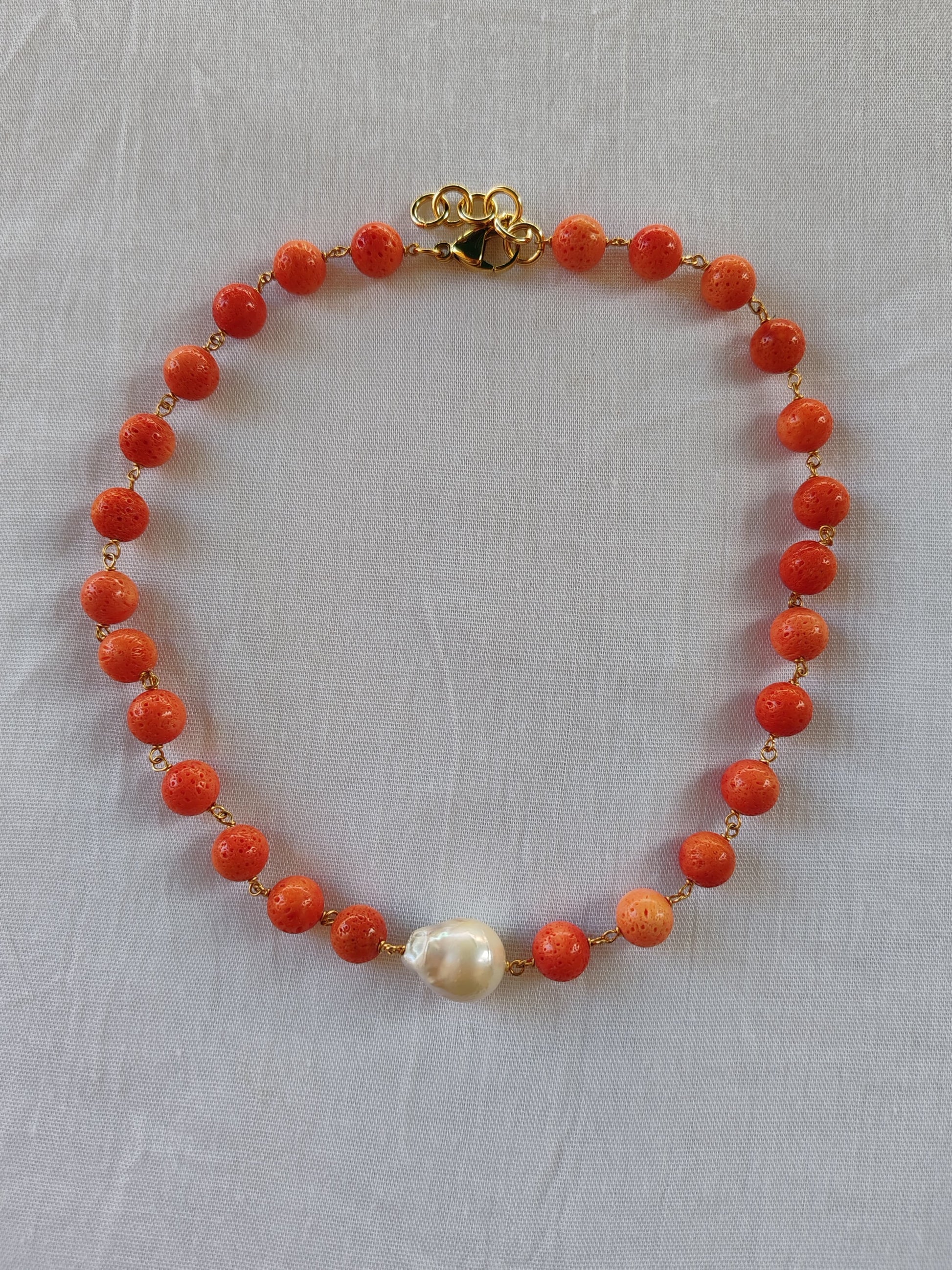 Il girocollo Coral , in corallo con una perla barocca imperfetta centrale. Realizzato a mano, con cura e attenzione ai dettagli, è il perfetto connubio tra arte e moda. Aggiungi un tocco di lusso alla tua collezione di gioielli con il nostro Girocollo. Finiture placcato oro 18kt nickel free.