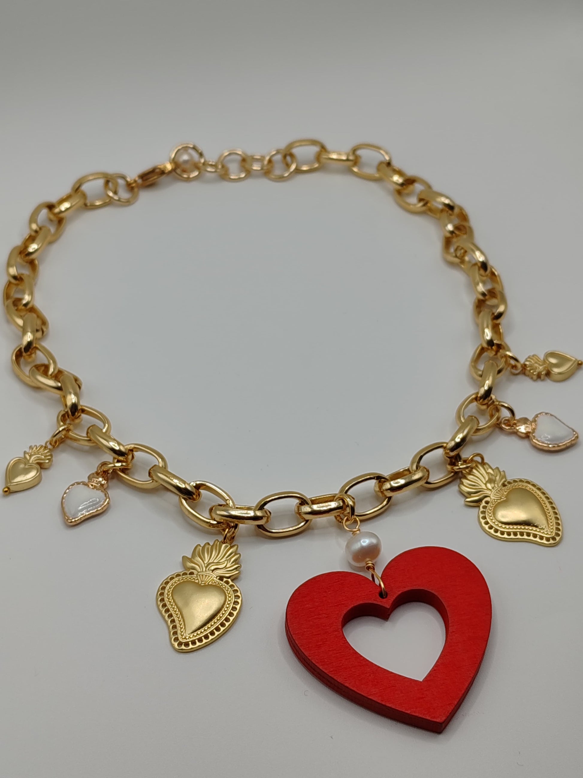 Fai battere il tuo cuore con Collana Regina di Cuori! Con una leggerissima catena e un cuore in legno dipinto a mano, questa collana è arricchita da charms smaltati e una perla naturale per uno stile unico e gioioso. Aggiungi un tocco di colore e divertimento al tuo outfit con questa collana.