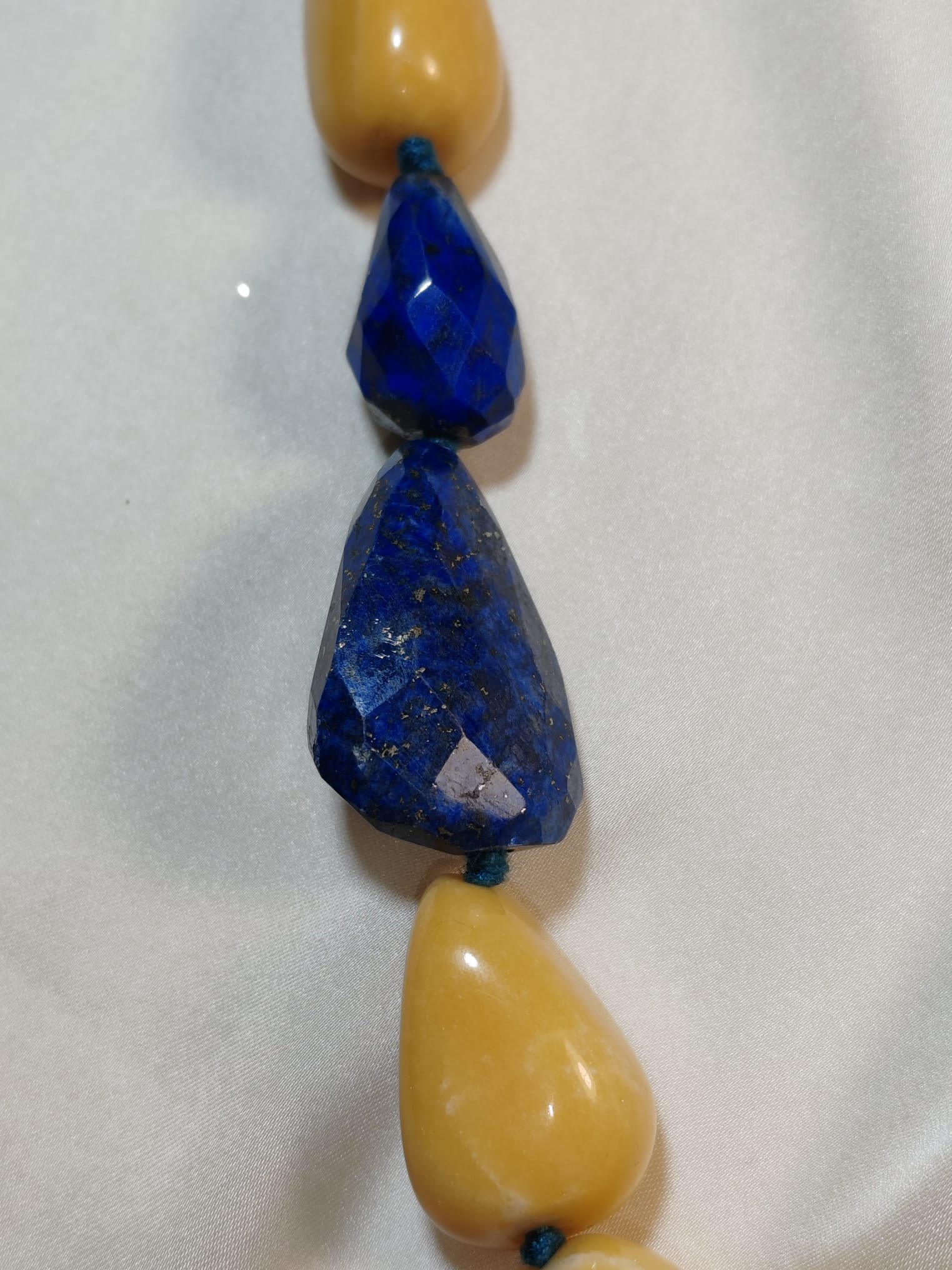 La calda Mokaite gialla mixata con il blu profondo dei Lapislazzuli sfaccettati,dà vita alla meravigliosa Collana Renè. Allacciata da particolare chiusura ad S in ottone placcato oro e infilata sapientemente a mano con tecnica a nodi.