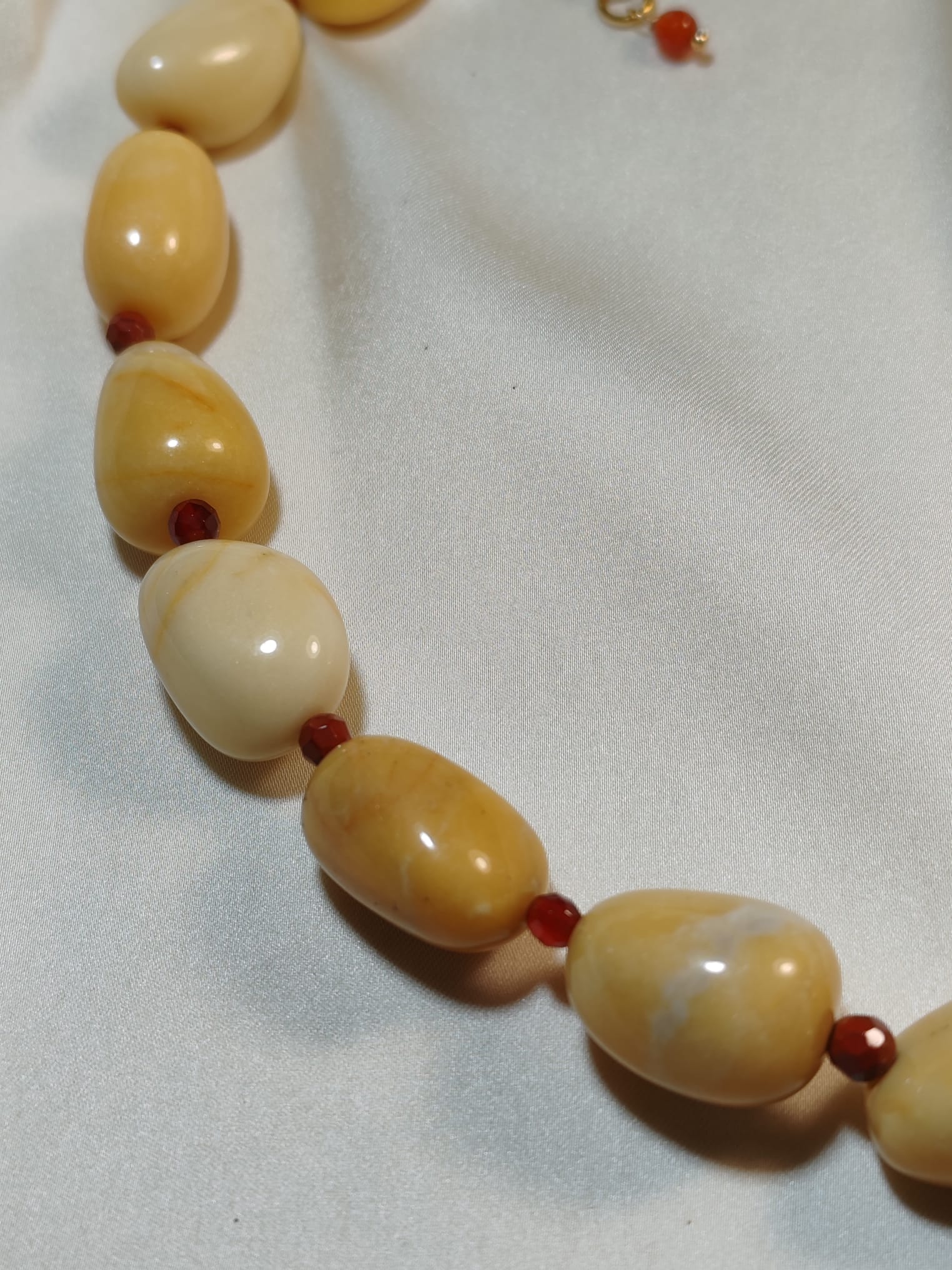 Il girocollo Asia combina l'eleganza della mokaite gialla con la preziosità delle piccole sfere in corniola e diaspro. Le pietre irregolari donano un fascino unico e sofisticato, perfetto per chi apprezza dettagli distintivi e una raffinatezza naturale.