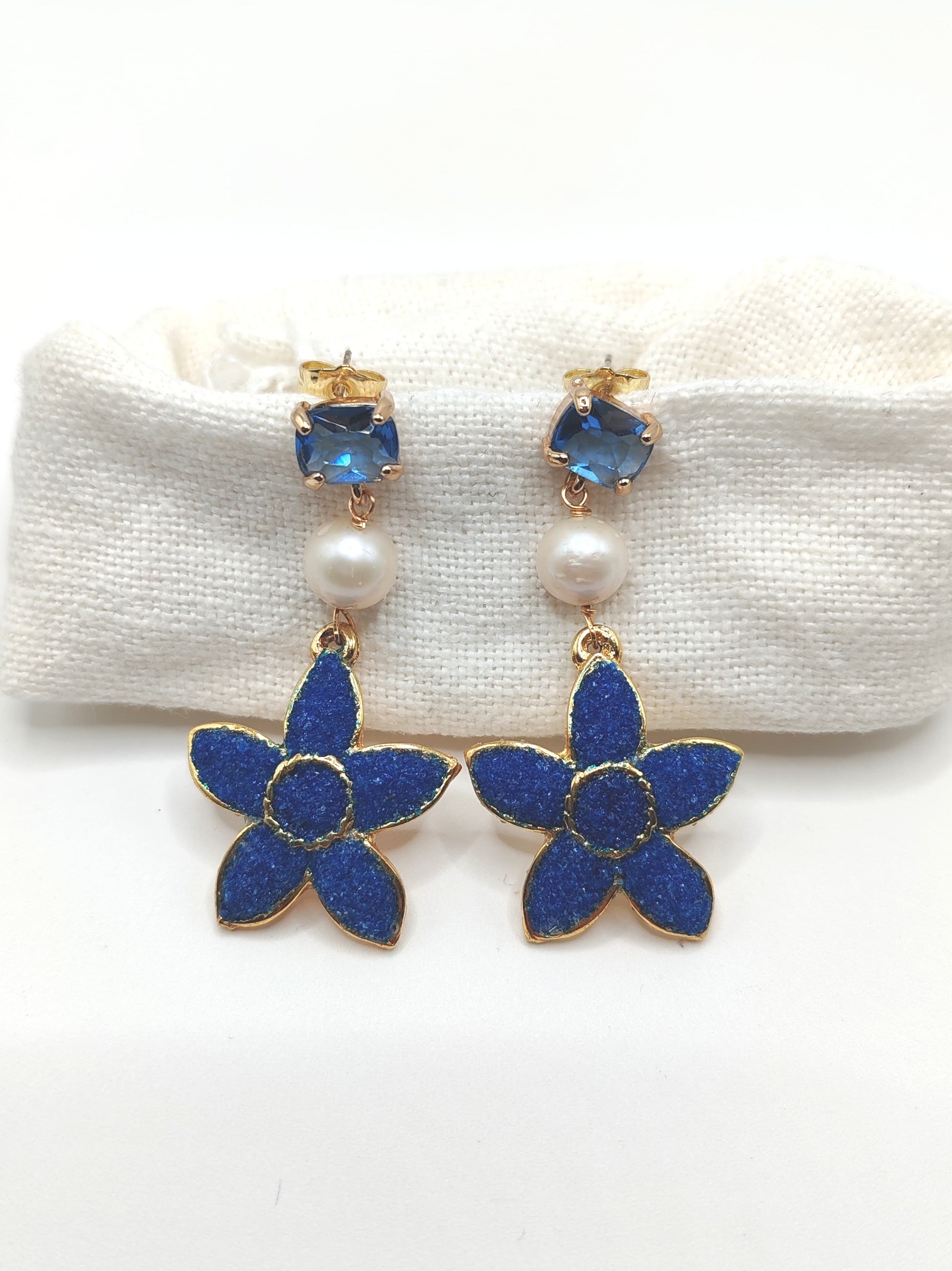 Esalta il tuo outfit con gli Orecchini Hula! Realizzati con un perno in cristallo blu ,una perla naturale e il fiore in mosaico di lapislazuli, questi orecchini aggiungeranno un tocco di eleganza e raffinatezza alla tua immagine.